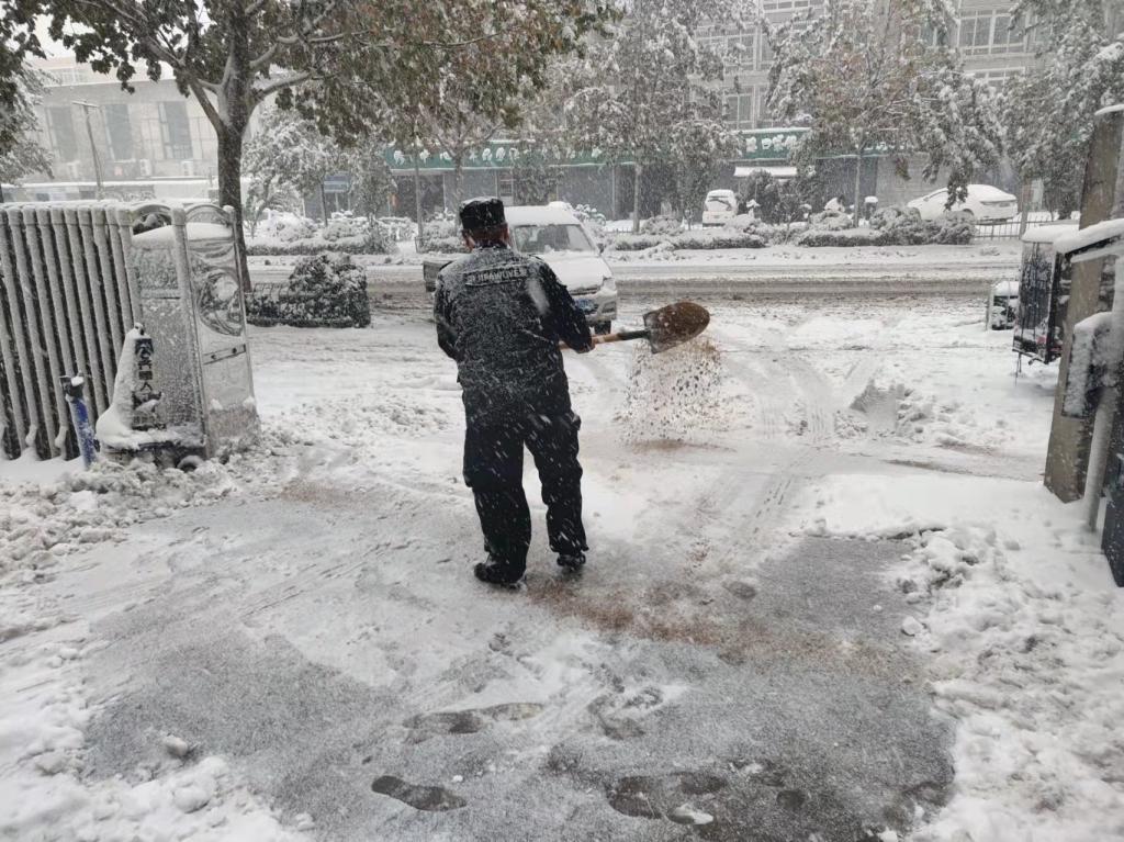 “看到保安师傅顶着寒风,挥舞着铁锨和扫帚,一点点将积雪和冰层铲起堆放,将积雪清扫干净,有这么贴心的保卫人员倍感温暖”一位准备出校的教师说。