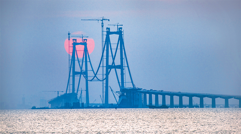 高质量发展是全面建设社会主义现代化国家的首要任务。党的十八大以来,我国不断厚植现代化的物质基础,机场港口、水利、能源、信息等基础设施建设取得重大成就。图为2022年10月29日,深圳市宝安区珠江口,一轮红日与在建的深中通道伶仃洋大桥相映成景。 人民图片 邱新生/摄