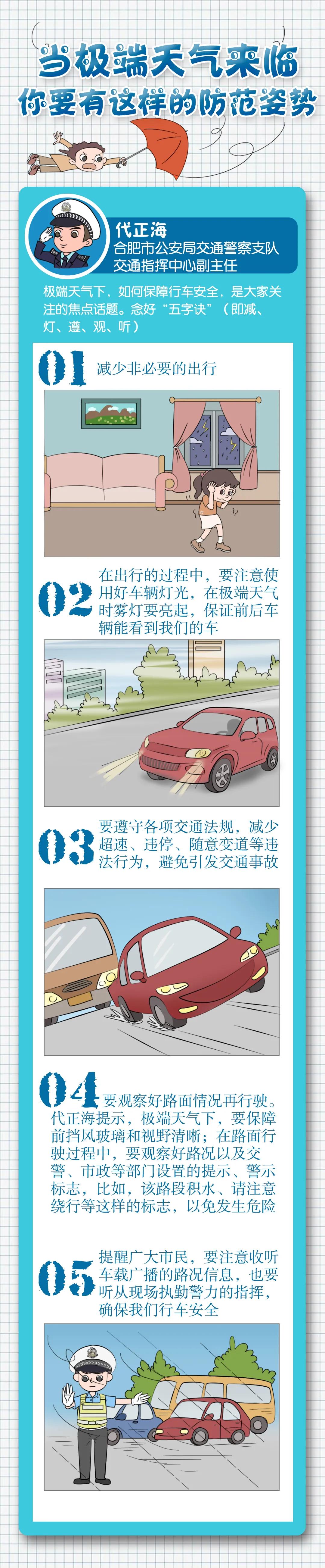 极端天气下,如何保障行车安全,是大家关注的焦点话题。念好“五字诀”(即减、灯、遵、观、听),是合肥市公安局交通警察支队交通指挥中心副主任代正海的提示。