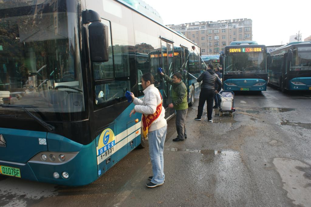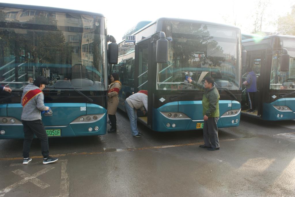 全体党员牢记为人民服务的宗旨,以饱满的热情投入到这次志愿服务活动当中。在进行合理分工后,大家纷纷拿起拖把、水桶、抹布,清理公交车的各处灰尘和污物。这是深秋的下午,大家却干的热火朝天,在公交停车场留下了辛劳的汗水,也留下了一辆辆焕然一新的公交车。看着自己清洁过的公交车驶出公交停车场的那一刹那,党员同志们的成就感油然而生。
