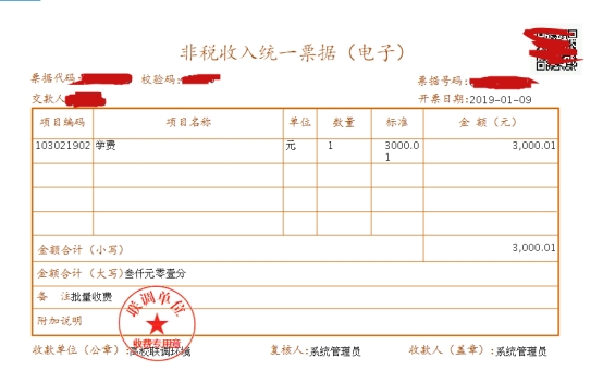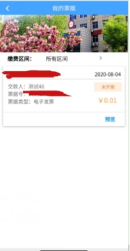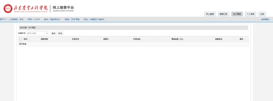 在“电子票据”界面下,显示缴费后由系统生成的电子票据。电子票据在学生缴费后由学校财务统一开具,具体时间另行通知。