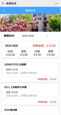 点击【缴费账单】,会显示出目前还没有完成缴费的项目信息和待缴金额总计。