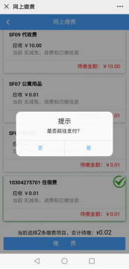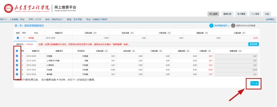 选择待缴的费用(可以多个项目一起交,也可以交单个项目),点击【下一步】