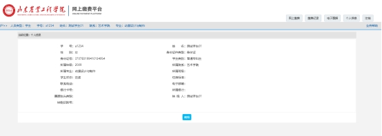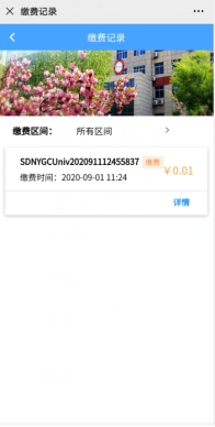 在【缴费记录】的菜单里,查看自己已缴款的项目、金额和缴款时间等信息。点击【详情】按钮,查看缴费明细。