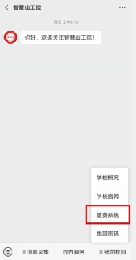 移动端地址:关注公众号【智慧山工院】,在右下角【我的校园】菜单中点击【缴费系统】进入。