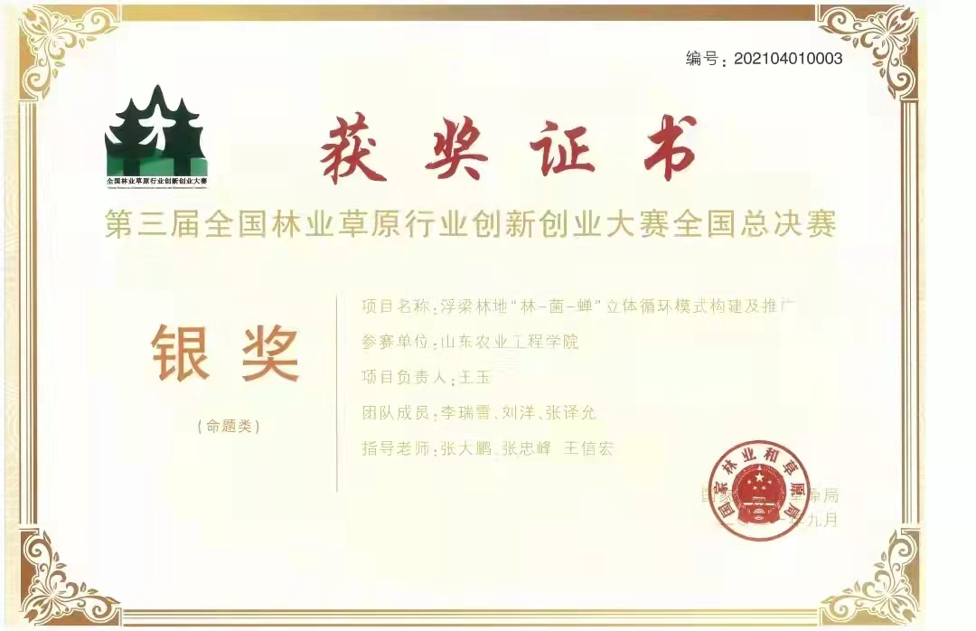 2021年9月,由创新创业学院院长张忠峰教授、林业工程学院学院张大鹏博士、王信宏老师指导的浮梁林地“林-菌-蝉”立体循环模式构建及推广项目,获第三届全国林业草原创新创业大赛总决赛---命题组全国银奖。
