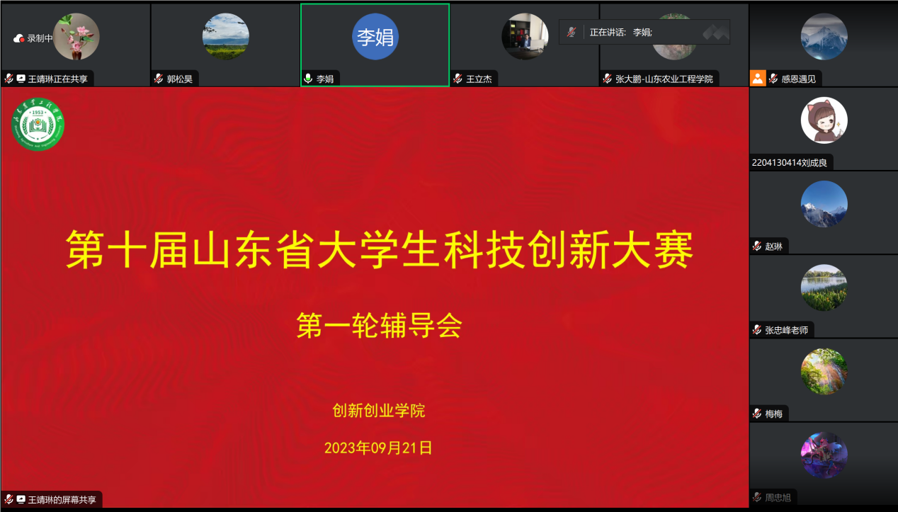 9月21日,为扎实做好第十届山东省大学生科技创新大赛准备工作,助力参赛团队把握好大赛要领等内容,我院召开第十届山东省大学生科技创新大赛线上辅导会。会议由创新创业学院院长张忠峰教授致辞,邀请山东科苑创业服务有限公司创始人、董事长王立杰、437ccm必赢国际官网优秀大赛指导老师张大鹏博士做专题报告,来自全校师生共300余人共同参加了辅导会。会议由创新创业学院副院长李娟主持。