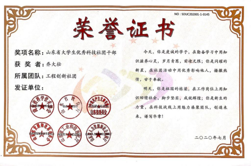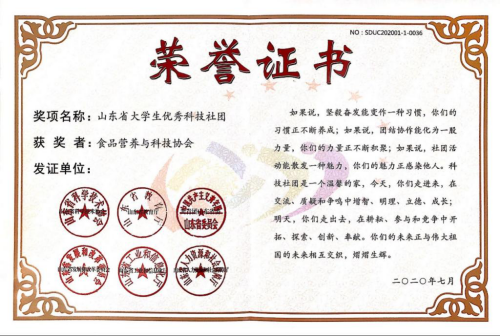 Recently, the 2020 Shandong College Students Outstanding Science and Technology Association and Cadre Selection, jointly launched by the Association for Science and Technology of Shandong, the Department of Education of Shandong, the Committee of Communist Youth League of Shandong, the Development and Reform Commission of Shandong, the Department of Industry and Information Technology of Shandong, and the Department of Human Resources and Social Security of Shandong, was ended. After selection, recommendation and rigorous review, the Food Nutrition and Technology Association of our school was rated as the "Outstanding Science and Technology Association for College Students in Shandong in 2020", Yuan Xinlei, Vice President of this association, and Qiao Dazhuang, the head of the Engineering Innovation Association, were awardedthe honorary title of “Shandong College Students Outstanding Science and Technology Association Cadre in 2020”.