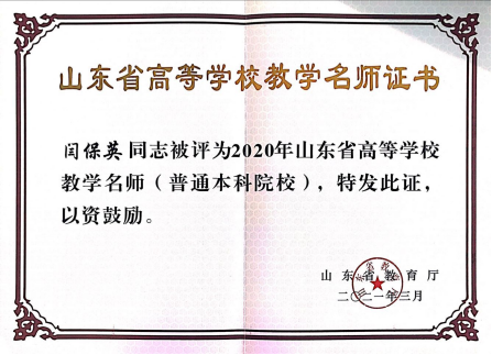 Recently, the results of the 2020 Outstanding Teachers of Shandong Universities selection organized by the Provincial Department of Education were officially announced. Professor Yan Baoying from the Department of Fundamental Courses Teaching of our school was honored on the list and won the honorary title of "Outstanding Teachers of Shandong Universities".