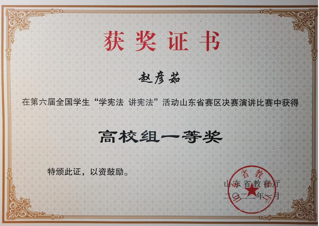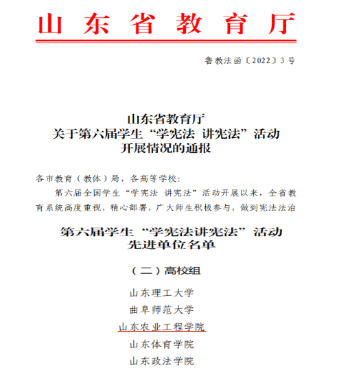 Recently, the Shandong Provincial Department of Education issued a report on the 6th Provincial Students "Learn the Constitution,Follow the Constitution" activity.SDAEU was rated as an advanced unit, two teachers were awarded as advanced individuals, andtwo teachers were awarded as excellent instructors, and Zhao Yanru, a student from the School of Agricultural Science and Technology, won the first prize in the speech contest.