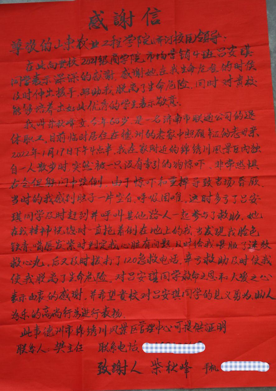 On the afternoon of January 17, Lv Anqi was walking in the same direction as a 68-year-old oldlady in Jinxiuchuan Scenic Spot in Dezhou City, Shandong Province. The oldlady was frightened and fell down by the dog that suddenly rushed over, causingher to faint and lose consciousness. Seeing this, Lv Anqi hurriedly called other passers-by for help, turn the oldlady over and take offher mask to breathe smoothly; seeingher lips turning purple and short of breath,she took immediate rescue measures, and then dialed 120 for an ambulance. Due to timely rescue, the oldlady was out of danger and has now recovered. In order to express her gratitude toour school and Lv Anqi,the old lady,Chai Qiufeng, sent a letter of thanks and full of affection and respect.