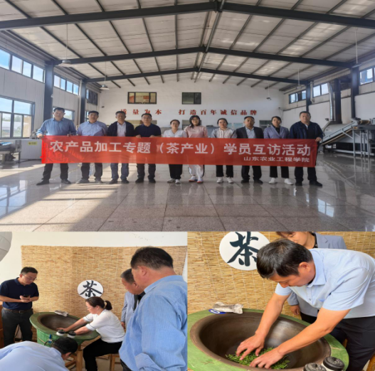 在诸城怡明茶叶李冰雪的茶叶加工车间内,工人正在进行红茶加工制作,大家聚集在茶叶揉捻的机器前,仔细观察。秦旭教授现场给大家讲解揉捻的专业知识及操作技法。学员们就茶叶加工中如何保持色泽、提升口感进行现场探讨。在诸城大家还参观了鸿雨抹茶科技有限公司,了解抹茶加工工艺、茶叶精深加工,启发学员延伸产业链、提高产品价值。