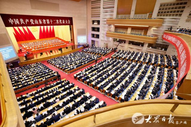 今天上午的山东会堂,气氛隆重而热烈。主席台上方悬挂着“中国共产党山东省第十二次代表大会”的会标,后幕正中是镰刀和锤头组成的党徽,10面鲜艳的红旗分列两侧。二楼和三楼眺台上悬挂着“坚持以习近平新时代中国特色社会主义思想为指导,牢记嘱托走在前,勇担使命开新局,为建设新时代社会主义现代化强省而努力奋斗!”“坚定拥护‘两个确立’,坚决做到‘两个维护’,为实现第二个百年奋斗目标、实现中华民族伟大复兴的中国梦作出更大贡献!”的横幅。