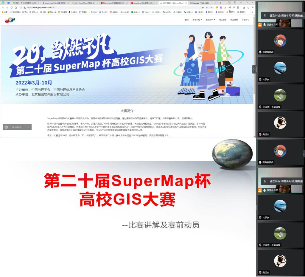 2022年4月7日,我院遥感科学与技术教研室召开了第二十届SuperMap杯高校GIS大赛动员会,指导老师以及有参赛意向的学生参会。会议主要向学生介绍比赛详细情况,并初步讨论确定比赛项目、主题。