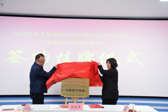 仪式上,党委委员、副校长郑华美和山东德昀总经理张纯涛共同为实践教学基地揭牌。