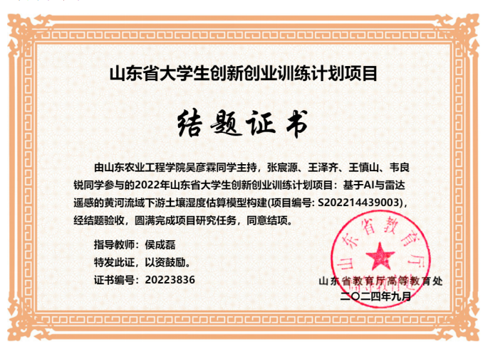 近日,我院遥感科学与技术专业吴彦霖、张宸源、王泽齐、王慎山、韦良锐同学参与的山东省大学生创新创业训练计划项目《基于AI与雷达遥感的黄河流域下游土壤湿度估算模型构建》(项目编号:S202214439003),经山东省教育厅高等教育处审核,圆满完成研究任务,顺利结项,指导教师为侯成磊。