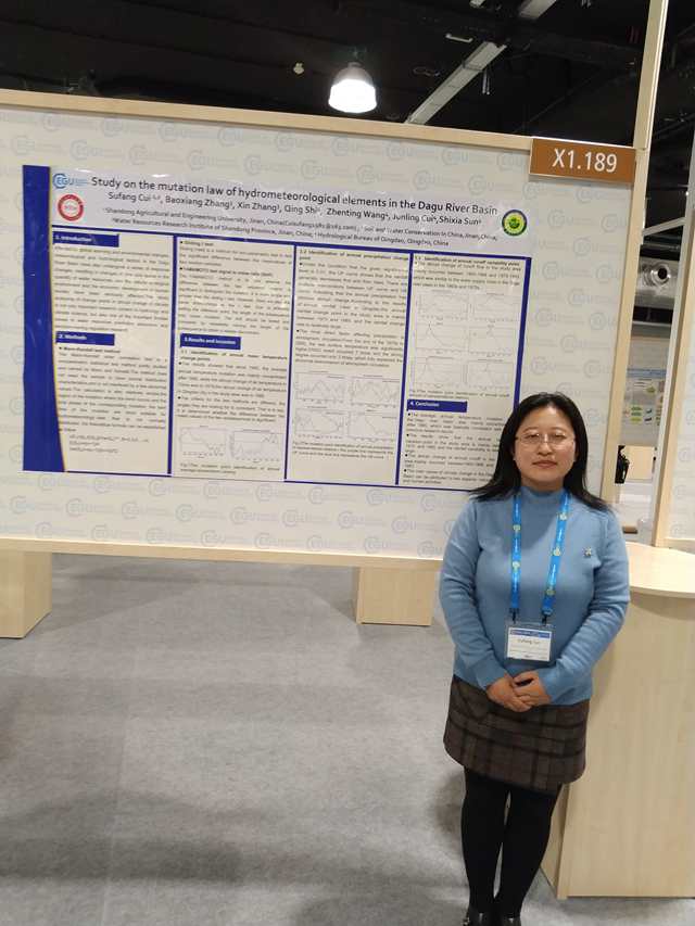 应欧洲地球科学联合会主管凯特琳.克鲁格教授邀请,我院教师崔素芳代表学校于201946日至2019414日赴奥地利维也纳市,参加了“欧洲地球科学联合会2019年年会(EGU)”。以“大沽河流域水文气象要素突变规律研究”为题做展板报告,向国际同行展示最新研究成果;与国际同行进行学术交流,商讨科研合作、学术互访、人才培养等相关事宜。