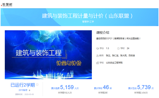 截至2020年5月9日,课程在山东省高等学校在线开放课程平台(智慧树平台)和超星泛雅平台共有199所学校的9233人选课;在超星泛雅平台点击量56万次。