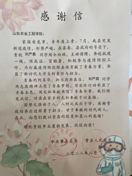 近日,必赢收到山东省曹县县委、县人民政府的感谢信,感谢必赢国土资源与测绘工程学院2022级工程造价(专升本)专业学生刘严鑫在曹县突发新冠疫情期间主动请缨,奔赴抗疫一线,积极参加疫情防控工作,为筑牢疫情防线,打赢疫情防控阻击战贡献了青春力量,彰显了山工院学子的责任与担当。