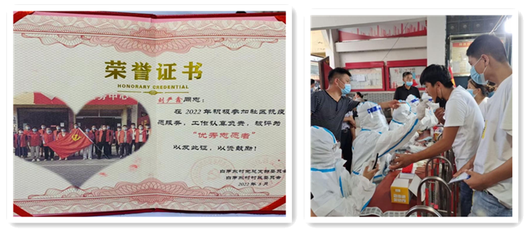 2022年7月,曹县突发新冠疫情,作为一名退役大学生士兵,刘严鑫同学率先投身疫情防控工作,在志愿服务过程中站好岗、尽好责,严格落实疫情防控的各项措施,服务好自己所负责的街道与人员。在遇到年迈和行动不便的老人做核酸时,作为志愿者,主动开车带老人去核酸采集点完成采集,并送老人回家;遇到身体不适却因封路无法去看病拿药的老人时,积极询问病情并及时报告政府管理卡点给予帮助。