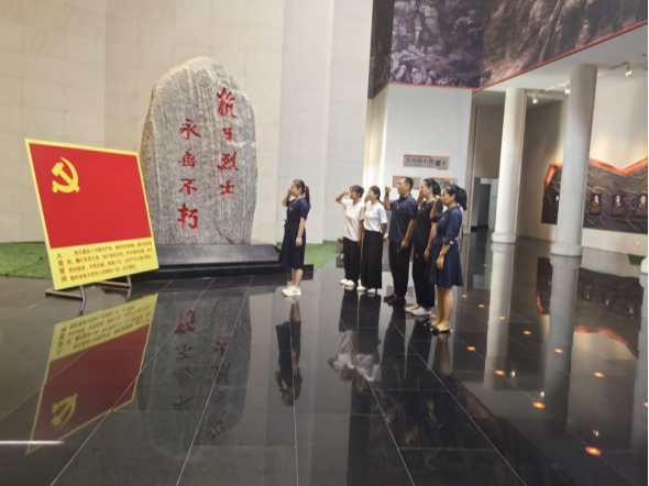 追忆英烈,走进鲁中抗日战争展览馆。映入眼帘的一幅幅图片、一幕幕场景、一帧帧影视画面,真实还原了抗日战争期间鲁中地区党政军民团结一心,不怕牺牲,敢于斗争的壮烈情景,彰显了革命烈士英勇卫国的爱国精神和家国情怀。每一个场景都活现着伟大共产党人精神,涤荡心灵,直击党员的思想、内心。党员同志在这里体悟着革命的艰辛和百年的沧桑。深刻地感悟到共产党人对理想的执着坚守,对人民的无比热爱。怀着崇敬的心情,涌动着奋进的斗志,李华同志带领大家在“抗日烈士、永垂不朽”的石碑旁,面向党旗,重温了入党誓词,誓词铿锵、字重千钧。