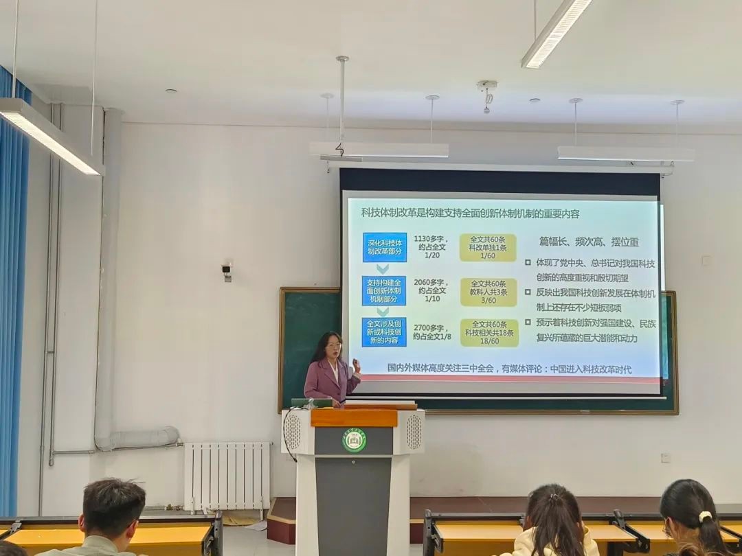 本次宣讲会特邀马克思主义学院孙真真老师,讲授党的二十届三中全会精神,孙老师围绕科技、过去、现在、未来四个方面,结合相关重要文件,深入浅出地讲解了全会的重大意义、总体要求、重要举措等内容。通过孙老师的讲解,同学们对党的二十届三中全会精神有了更深刻地理解和认识。在交流讨论环节,同学们积极发言,分享自己的学习心得和体会。他们表示,通过本次学习更加坚定了自己的理想信念,未来要将个人的发展与国家的现代化建设紧密结合起来。