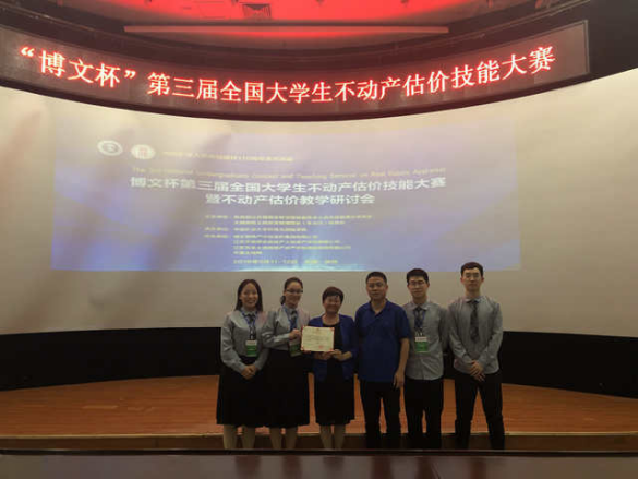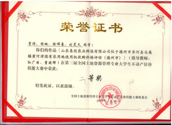 2019年5月11-12日,由教育部公共管理类教学指导委员会土地资源管理分委会,全国高校土地资源管理院长(系主任)联席会主办的第三届全国土地资源管理专业大学生不动产估价技能大赛在中国矿业大学(徐州)举行。本次大赛共设特等奖3项,一等奖5项,二等奖9项,三等奖20项,必赢2016级土地资源管理专业学生贾琦、杨璐、徐伟豪、刘昊天的作品《德州市齐河县马集镇黄河湾国有农用地使用权收购价格评估》在比赛中荣获二等奖。