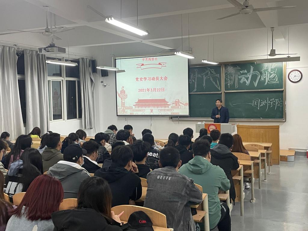 学校召开党史学习教育动员大会以来,学习党史成为庆祝建党100周年的一项重要活动,一种自发的学习新动向。我院开展了多层次、多方面的党史学习动员会议。2021年3月18日,学生党支部召开党史学习动员会,开启党课大讲堂,开展“一周一讲”活动,学生党员陈红燕、陈润星首先开讲。2021年3月22日晚上7:00,我院思政社团召开党史学习动员大会,党总支书记孙承运做了动员发言。2021年3月25日下午1:30,党总支委员会召开党史学习动员会,下午2:30,我院召开全体教职工党史学习动员大会。