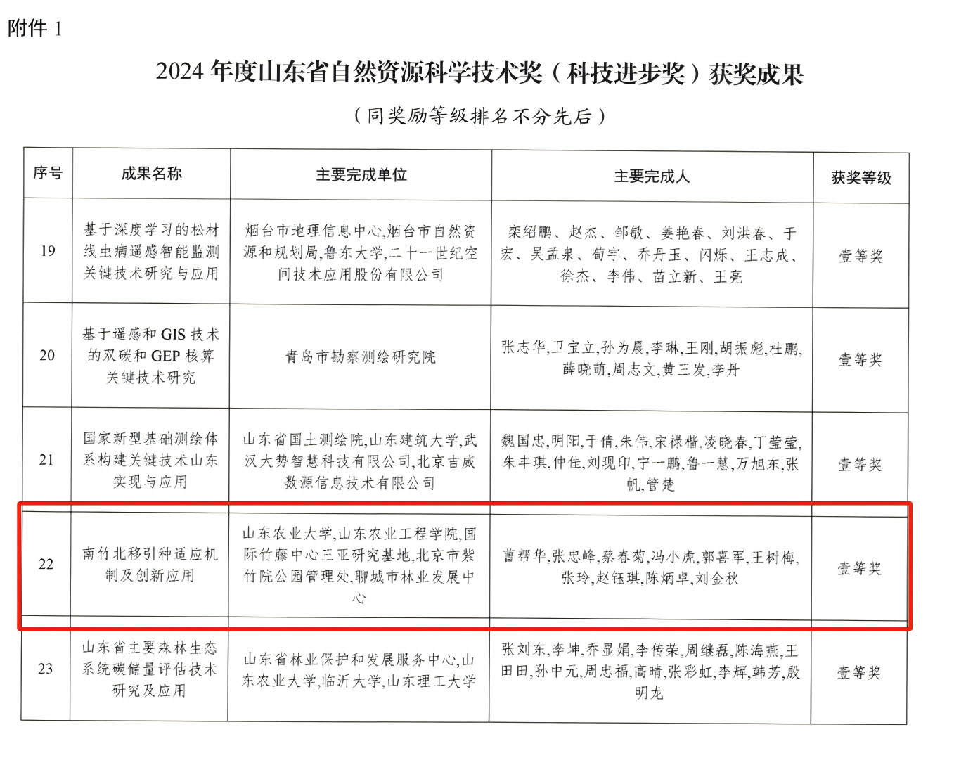 近日,我院院长张忠峰教授的“南竹北移引种适应机制及创新应用”项目,荣获2024年度山东省自然资源科学技术奖(科技进步奖)壹等奖。