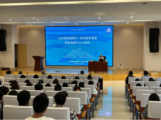 白中科教授围绕“山水林田湖草沙一体化保护修复科技创新与人才培养”的相关问题展开报告,结合自己多年研究成果系统介绍了山水林田湖草沙一体化保护修复的创新方法,对人才培养进行了深入的解读。他勉励师生要心怀社稷、情系苍生,坚持把论文写在田间地头,实现中华民族伟大复兴的中国梦。