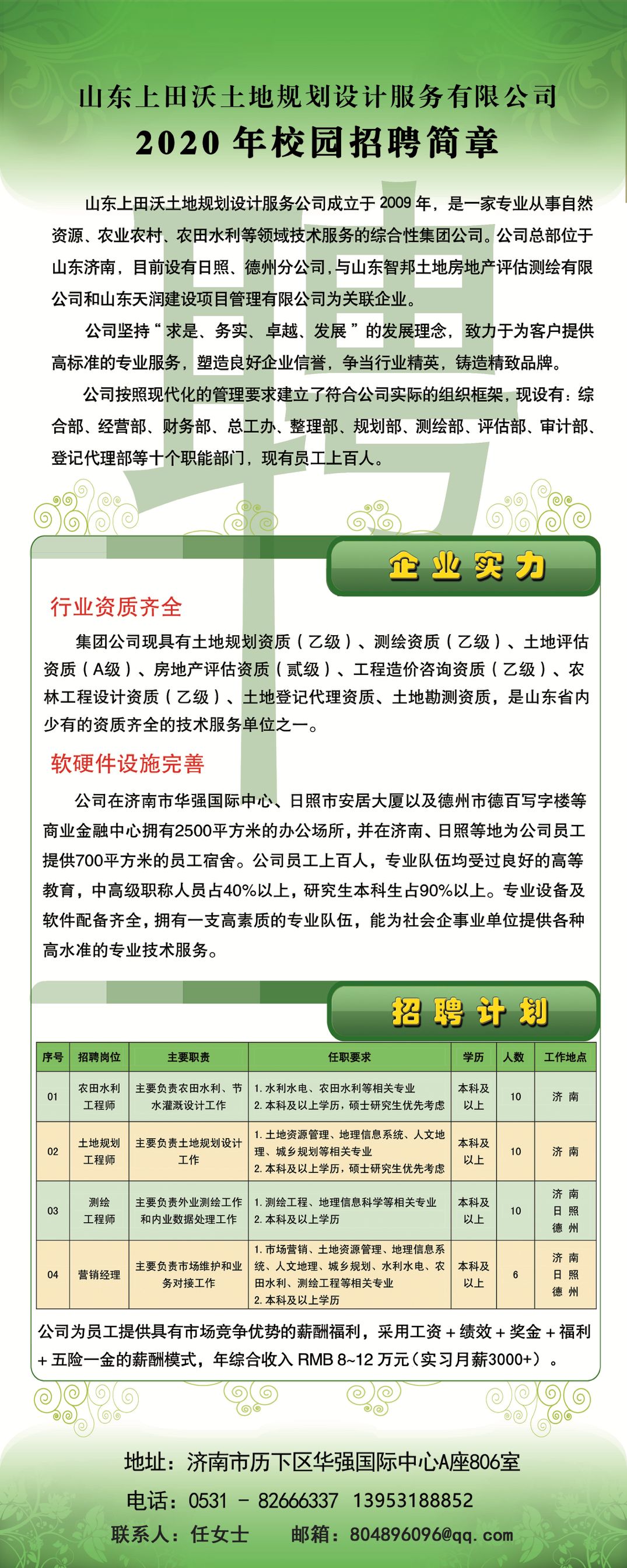 山东上田沃土地规划设计服务有限公司2020年校园招聘简章