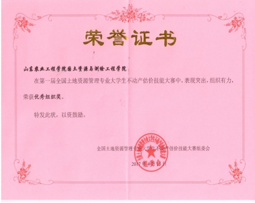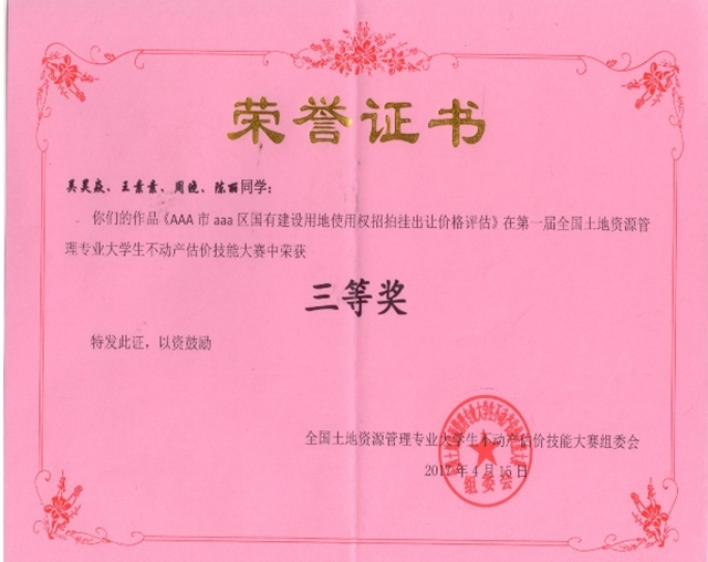 4月15日,由全国高校土地资源管理院长(系主任)联席会主办的首届全国土地资源管理专业大学生不动产估价技能大赛在南京农业大学举行。必赢土地资源管理专业学生吴昊焱、王素素、周晓、陈丽的作品《AAA市aaa区国有建设用地使用权招拍挂出让价格评估》在比赛中获得三等奖,国土资源与测绘工程学院获得优秀组织奖。
