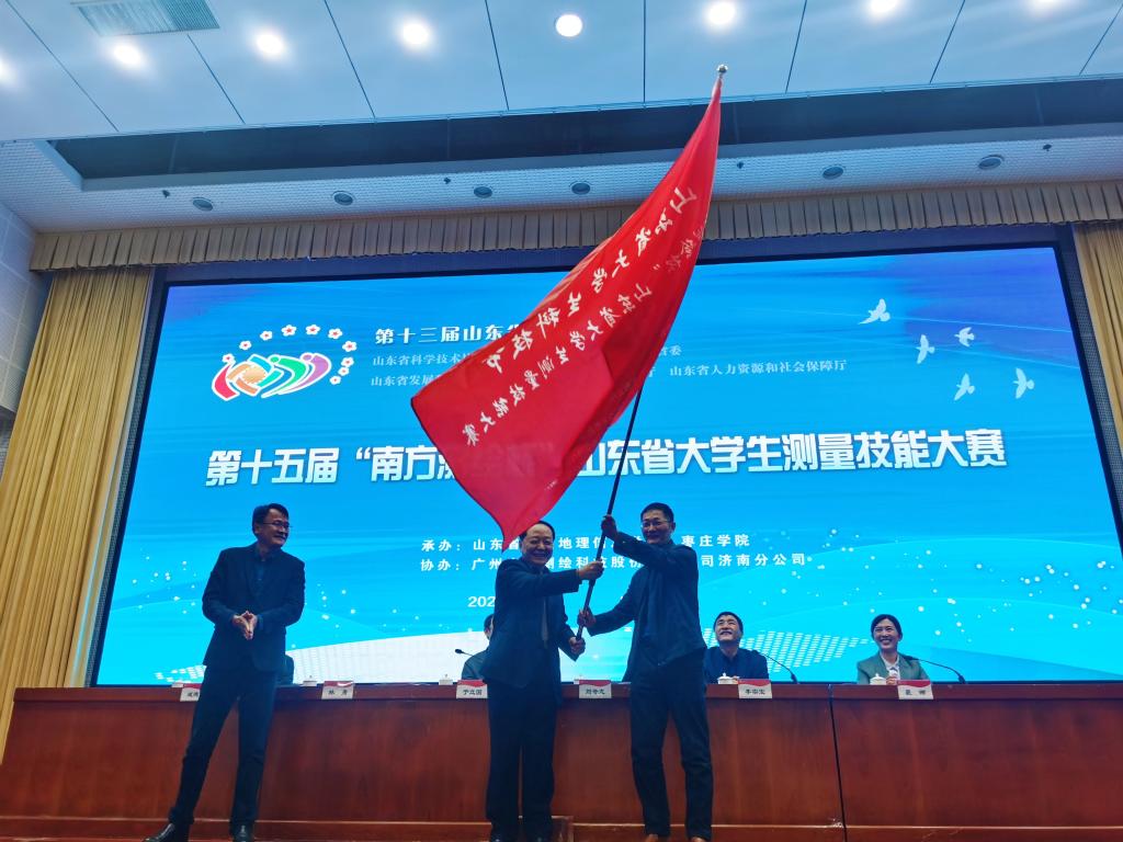 在闭幕式上,比赛承办方山东省测绘地理信息学会秘书长刘奇志将代表承办授权单位的旗子由枣庄学院林院长手中接过,传到我院曹院长手中,明年必赢将作为本次大赛的承办方,共同为我省测绘行业交流学习提供平台。