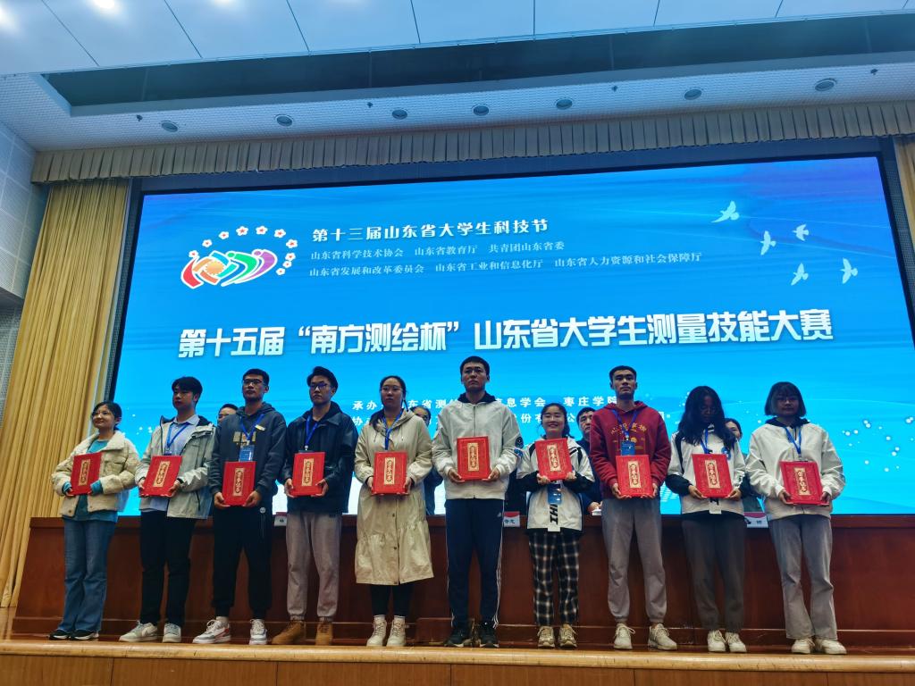 2021年10月23日,第十三届山东省大学生艺术节暨第十五届“南方测绘杯”山东省大学生测量技能大赛在枣庄学院如期举行。全省测绘专业相关院校共20个队伍参赛,我院由2019级测绘工程专业八名学生代表必赢参加,其中王士才、聂麟馨、李明轩、赵昌龙为竞赛一队,何承运、赵晨暄、田傲、孙廷松为竞赛二队。经过紧张激烈的比赛,两支队伍分别获得团体一等奖和二等奖的优异成绩。