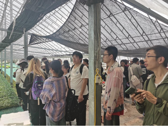 随后的野外踏勘环节,李永老师实地讲解了“田块大方”的规划设计、大田作物种植结构、机井科学布局、农田滴灌系统建设、田间道路网络、农田防护林体系及土壤质地状况等关键内容。重点分析了滴灌技术在节水节电方面的显著优势,并详细介绍了滴灌带的铺设方法,引导学生“知农事、懂农情”。师生一行还参观了康美育苗基地,考察了辣椒、西红柿等作物的育苗技术与种植经济效益。
