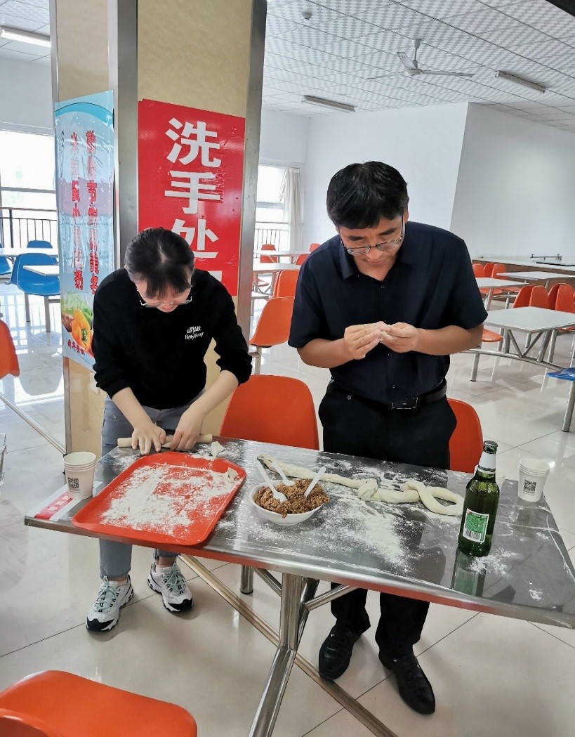 趣味运动会举办完毕后,同学们纷纷来到南苑食堂二楼参加包饺子活动,同学们来自五湖四海,包饺子的手法也是各不相同。女同学们心灵手巧,包出的饺子精美别致,男同学们也不甘落后的想出了各种创意,包出的饺子形状各异、各不相同,引起同学们一阵阵欢笑。孙书记、两位辅导员老师和两位班主任老师也加入了同学们的阵容,帮助同学们完成包饺子大业。