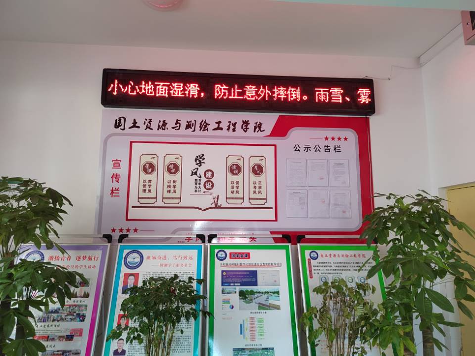 2021年11月7日,齐河暴雪,气温骤降,为避免极端天气引发安全事故,学院第一时间利用教学楼的LED显示屏进行安全出行温馨提示,辅导员、班主任召开班会,提醒学生提早做好安全防护措施,应对恶劣天气。