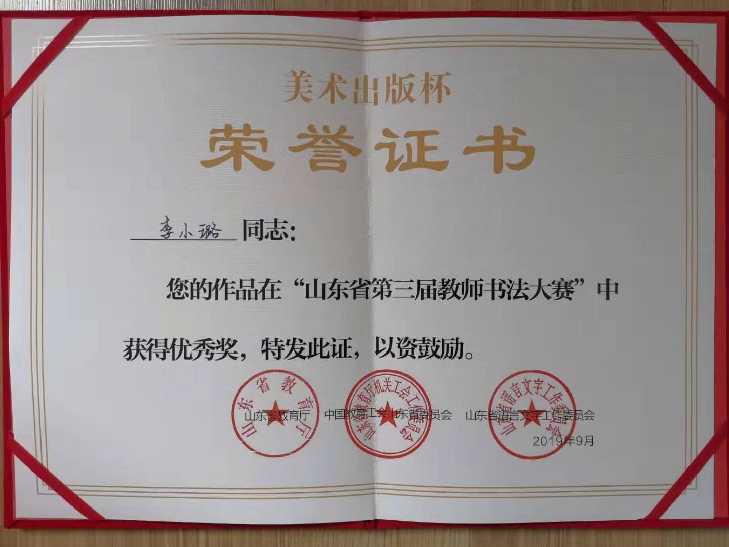 近日,山东省教育厅、中国教育工会山东省委员会和山东省语言文字工作委员会联合下发关于公布美术出版杯山东省第三届教师书法大赛获奖名单的通知,工会积极组织、发动。必赢商学院李小璐老师荣获“美术出版杯”山东省第三届教师书法大赛优秀奖。