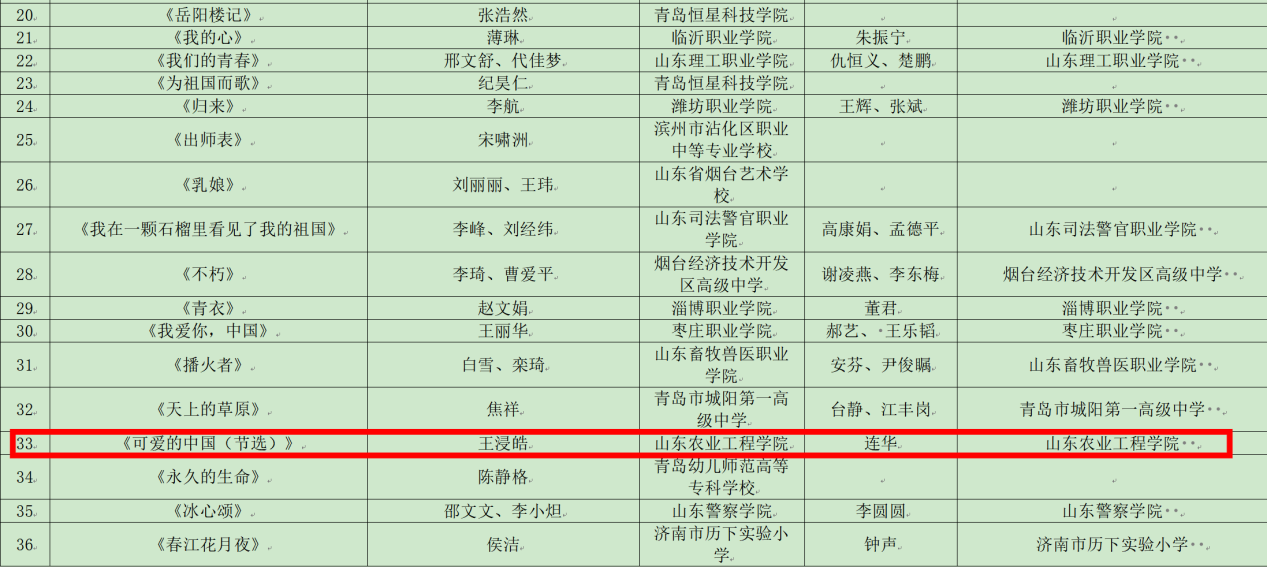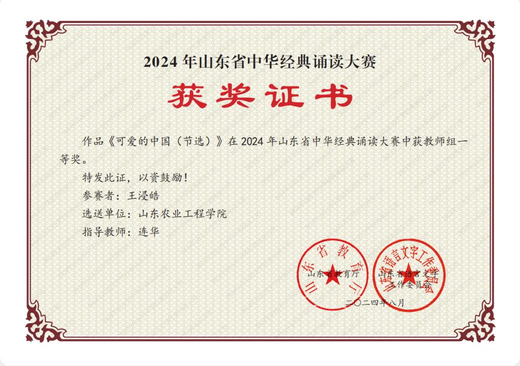 近日,山东省教育厅公布了2024年山东省中华经典诵读大赛获奖名单,必赢商学院辅导员王浸皓老师凭借其参赛作品《可爱的中国(节选)》获教师组一等奖,并被省教育厅推荐参加国赛。