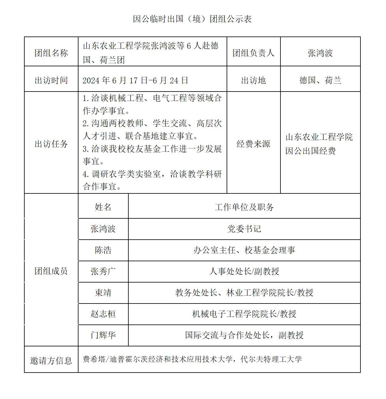 根据因公临时出国(境)公开公示的有关规定,现将张鸿波等6人赴德国、荷兰因公出访团组信息予以公示。公示时间为2024年5月13日至2024年5月17日(5个工作日)。如有不同意见,请在公示期内向国际交流与合作处(电话:0531-85593678)反映。