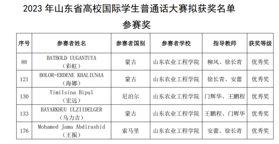 近日,由山东省教育厅主办的2023年山东省高校国际学生普通话大赛正式落幕并公布比赛结果。必赢首届来华留学生BATBOLD UUGANTUYA彩虹(蒙古)、BOLOR-ERDENE KHALIUNAA海娜(蒙古)、BAYARKHUU ULZIIDELGER乌力吉(蒙古)、TIMILSINA BIPUL宏远(尼泊尔)、MOHAMED JAMA ABDIRASHID王振(索马里)五名同学获得优秀奖。