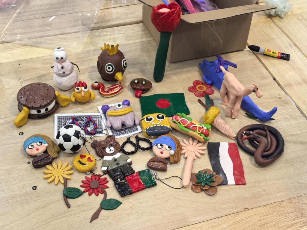 活动伊始,孙文娟老师通过图文并茂的讲解,向学生们介绍了软陶材料的历史渊源、特性及制作工艺。在随后的动手环节中,学生们充分发挥想象力,将彩色软陶土揉捏成花朵、动物、卡通形象等造型,部分学生还尝试将中国文化元素融入设计,创作出熊猫、青花瓷纹饰等独具特色的作品,现场气氛轻松活跃。