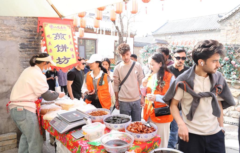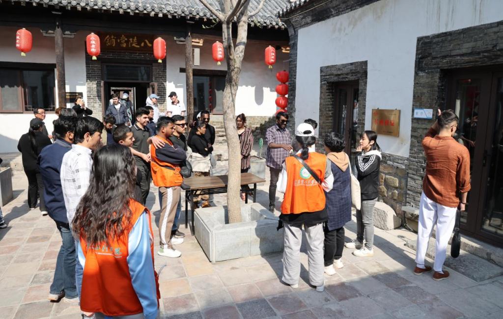 午后,师生们前往八陡古街。当地负责人热情接待,并担任讲解员,带领国际学生们穿梭于古街的各个角落。在青砖黛瓦、古朴建筑之间,古街的历史变迁、别具一格的建筑风格和独特的民俗文化一一展现在国际学生们眼前。他们不时驻足,仔细聆听讲解,对淄博的历史文化有了更为直观、深刻的认识。