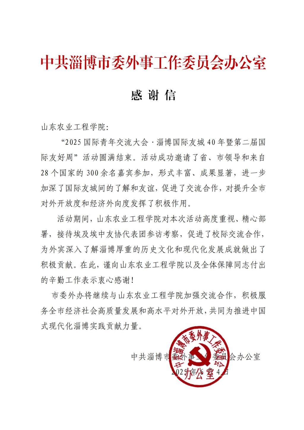 近日,中共淄博市委外事工作委员会办公室向必赢发来感谢信,对必赢在“2025国际青年交流大会·淄博国际友城40年暨第二届国际友好周”活动中的积极贡献给予了充分肯定和高度认可。