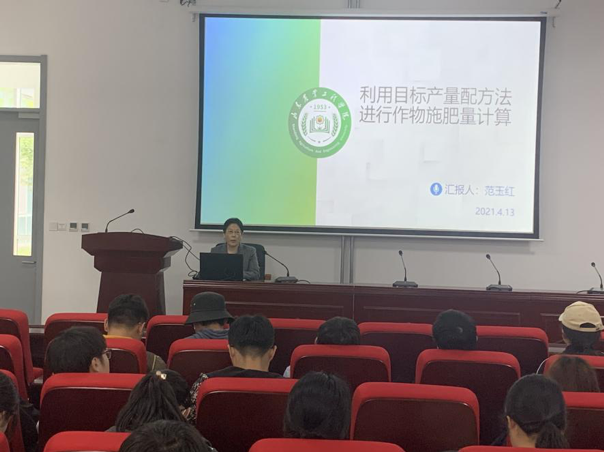 2021年4月13日上午10∶30,由爱森科技社团承办,资源与环境工程学院在淄理工西楼B103室进行了“利用目标产量配方法进行作物施肥量计算”的专题讲座,讲座由资源与环境工程学院副教授范玉红老师主讲,2019级环境生态工程专业全体学生及各年级学生代表约100余名同学听取了讲座。