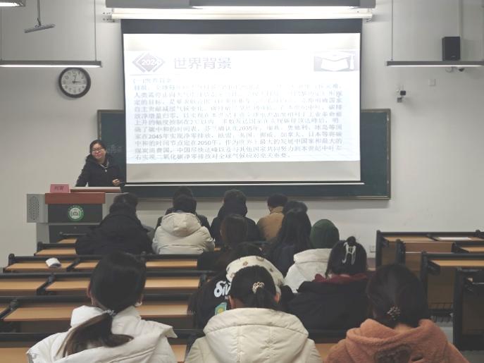 报告会上,刘青老师以世界背景和国内背景导入,讲解了双碳政策实施的必要性。接着,刘老师深度探讨了我国在推进现代化过程中所面临的生态保护和绿色转型的双重挑战和发展机遇,并表示我们应积极把握绿色发展机遇,推动经济可持续发展。然后,刘老师提出一系列创新的实现途径,如调整产业结构,推进源头防治等,推动如期实现双碳目标。最后,刘老师讲解了实验室的基本化学技能,强调其学习的重要性。