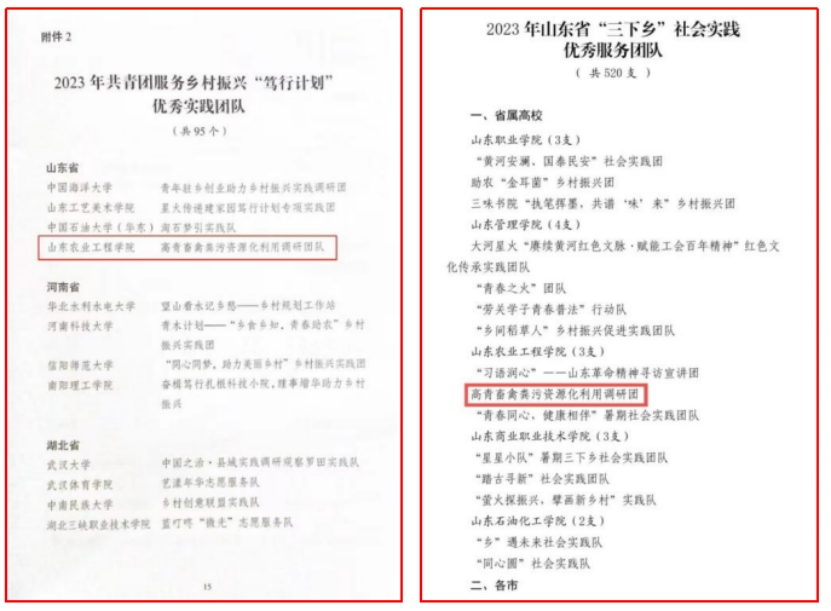 其中,学院副院长江丽华带队指导的“高青畜禽粪污资源化利用团队”荣获2023年共青团服务乡村振兴“笃行计划”国家级优秀实践团队。