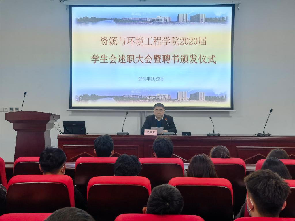 2021323日下午,资源与环境工程学院在理工西楼B103举行了2020届学生会述职报告会暨聘书颁发仪式。学院党总支负责人、副书记马朝阳,党总支副书记郑业萌出席会议,学院2020届学生会全体成员参加会议。