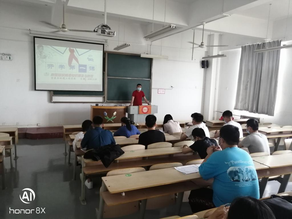 5月18日,我院按照防疫规定为2020春季学期返校毕业生在北校区2教322教室开设了开学第一课。辅导员郑业萌老师详细介绍了疫情防控的有关知识,告知返校学生要配合学校防疫工作,做好各项防护措施并及时做好记录。