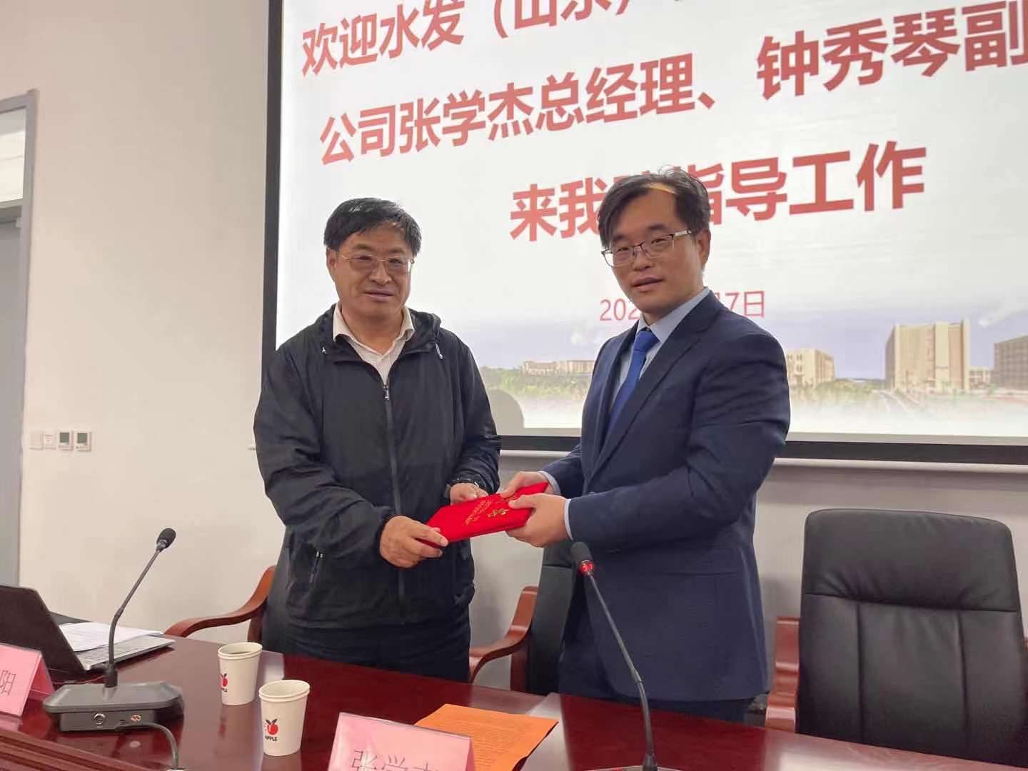 苗峰院长代表学校对外聘专家水发(山东)检验检测研究院有限公司总经理张学杰、副总经理钟秀琴一行的到来表示热烈欢迎。他指出此次聘任专家,不仅莘莘学子受益无穷,还将有效带动学院到企业挂职锻炼的年轻教师成长,提升学校教学质量,为学校的快速、持续发展注入新的动力。他希望,在未来校企双方进一步深度合作的进程中,双方各自发挥优势,积极深化合作内容,不断扩大合作领域,促进人才培养供给侧和产业需求侧结构要素全方位融合,实现优势互补、合作共赢。